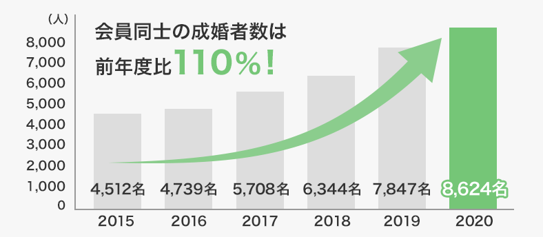 なかでも日本結婚相談所連盟(IBJ)に登録する会員同士の成婚は、年間約8,600名うまれており、前年度比で110%と年々向上していることが特徴です。