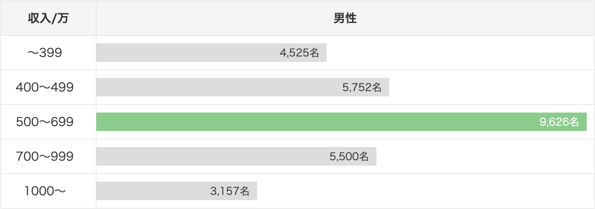 男性の公開年収を見ますと、女性が結婚相手に求める年収についての一般的なアンケート結果と同じ500〜699万円がボリュームゾーンとなっております。