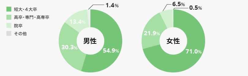 短大・四大・大学院を卒業した方が70%以上を占めるのが特徴です。